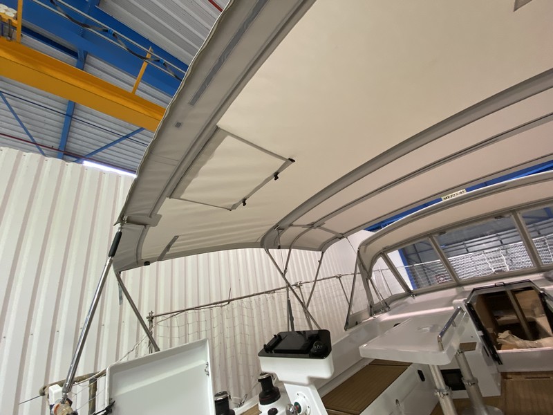 Compatible Cockpit Bimini Top. Helmsman Sun Protection. 1 stainless steel arches 30mm, secured with brackets on the balcony. Pataras position included, tensioned with front and rear straps. Cover, mounting kit, and instructions provided.