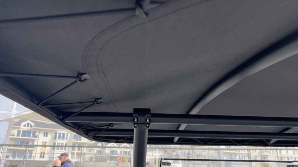 Sa structure en aluminium soudée Ø50 mm, renforcée par deux stabilisateurs latéraux, assure rigidité, tenue en mer et longévité. Son toit galbé favorise l’écoulement de l’eau et optimise la protection solaire. Avec 1,90 m de hauteur sous produit, il garantit un passage confortable, que ce soit pour la pêche, les loisirs nautiques ou la croisière familiale.